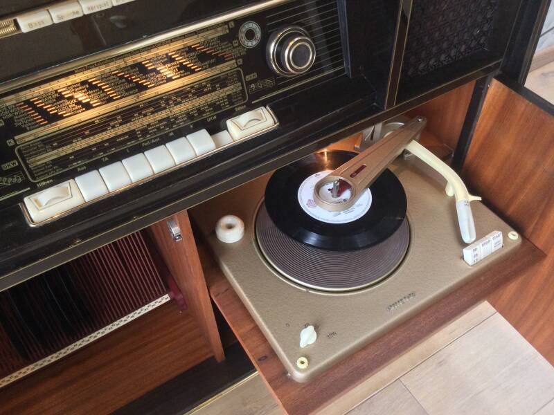 Onder het radiogedeelte zit rechts de platenwisselaar en links een vak met een platenrekje.