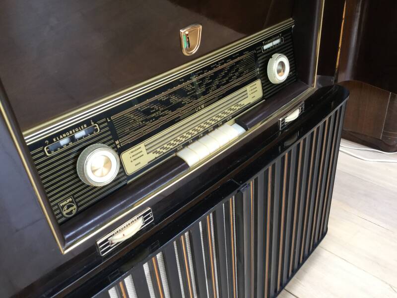 Deze zeer aparte uitvoering van de Philips Saturn uit 1956, is technisch zeer geavanceerd en valt op door de twee deurtjes die de radio/versterker afdekken.